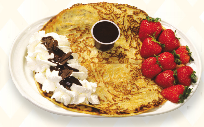 whipped cream, hot Belgian chocolate, ice cream, jam, syrup, dulce de leche, maple, Nutella, spéculoos, fresh fruit, strawberry, banana, butter, flambé.
